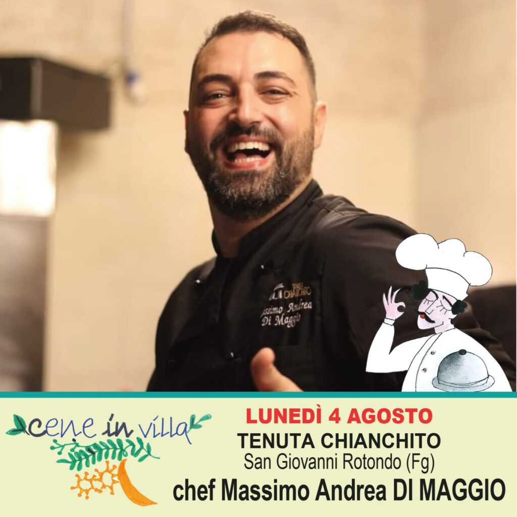 Massimo Andrea di Maggio brings the philosophy behind his cuisine, ‘from the garden to the stove,’ to the orange grove at the Mercatino del Gusto. The garden is located behind his Masseria Chianchito, at the foot of the Gargano, and is abundant with vegetables and fruit. It is the fundamental basis for his Mediterranean cuisine, which includes meat and fish, marked by the seasonality of tradition, but not without a certain innovative flair.